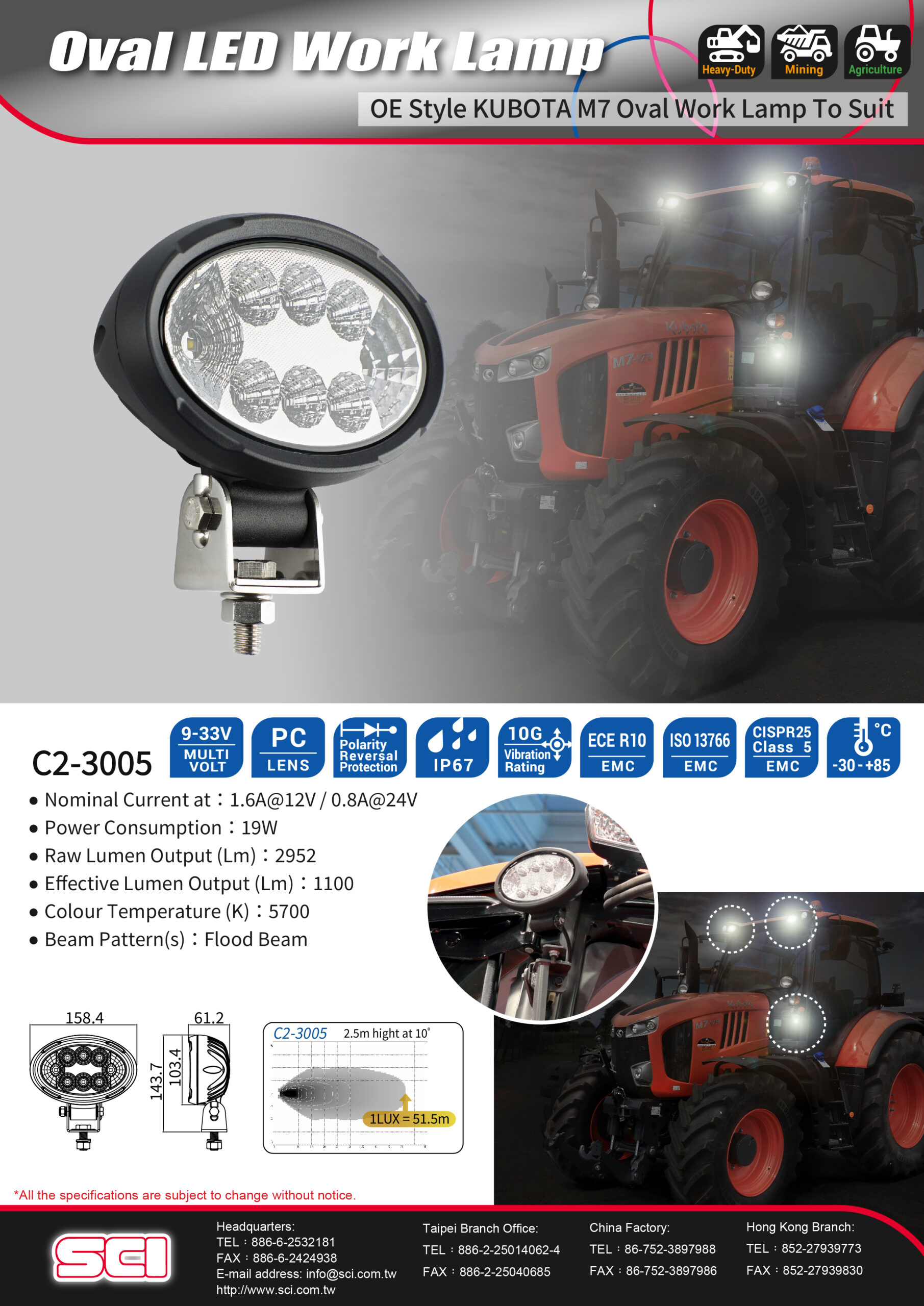 Medium oval work lamp with eight high-power LEDs and the low power consumption of 19W achieves the high efficiency output.