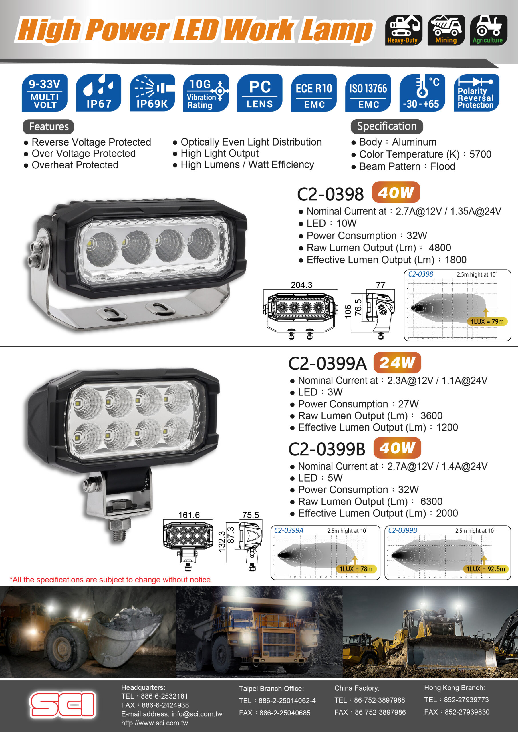 C2-399A 9-33V Heavy-Duty Rectangular LED Work Lamp – Flood Beam(24W)