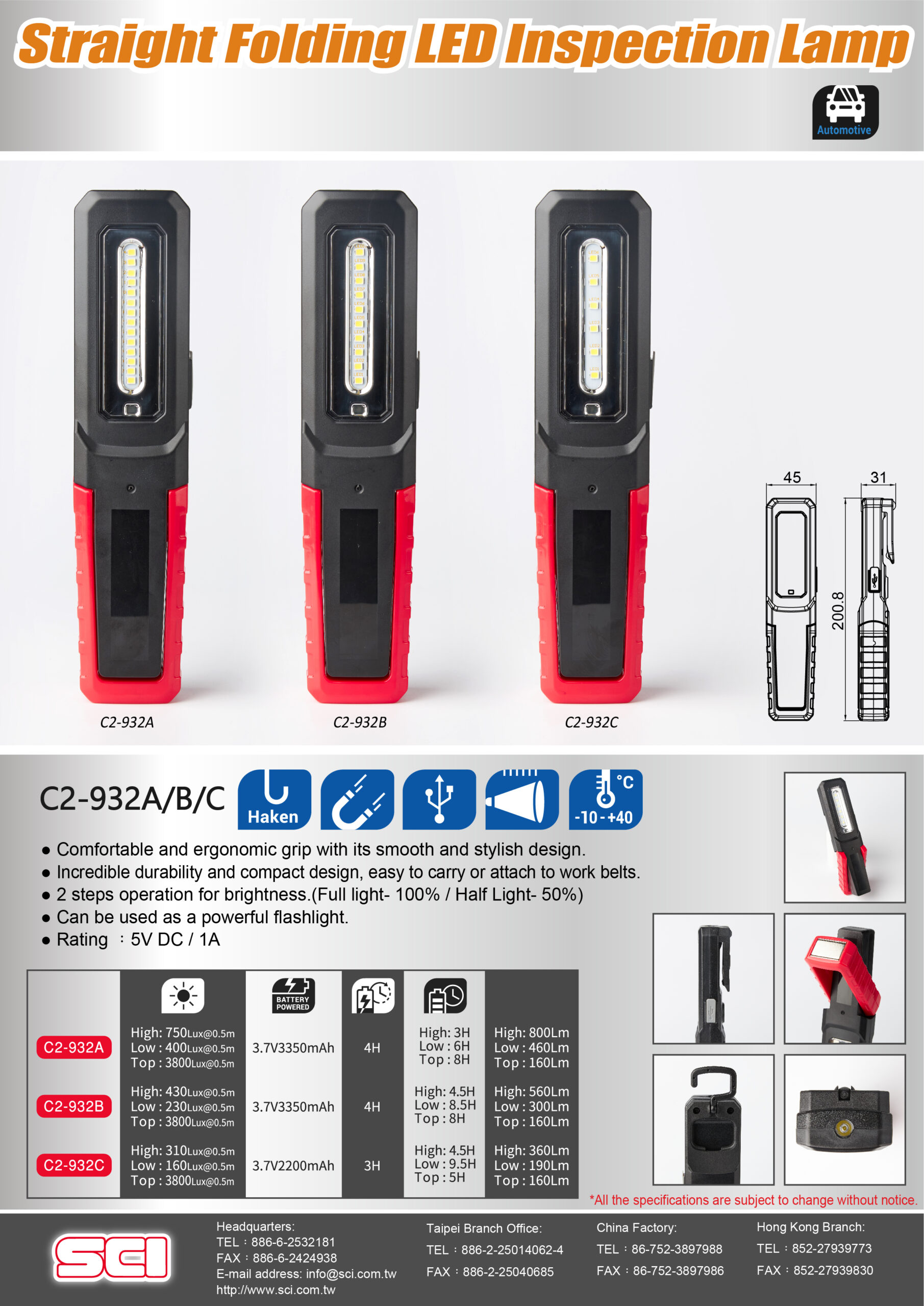The C2-932A Portable Work Light features a high-brightness main LED and a top inspection light. It supports Type-C charging and has passed 2m drop tests and cold/heat environmental tests, with CE certification for safety and reliability. The magnetic base and rotatable hook allow hands-free use in job sites, automotive repair, warehouse inspection, and outdoor field work.