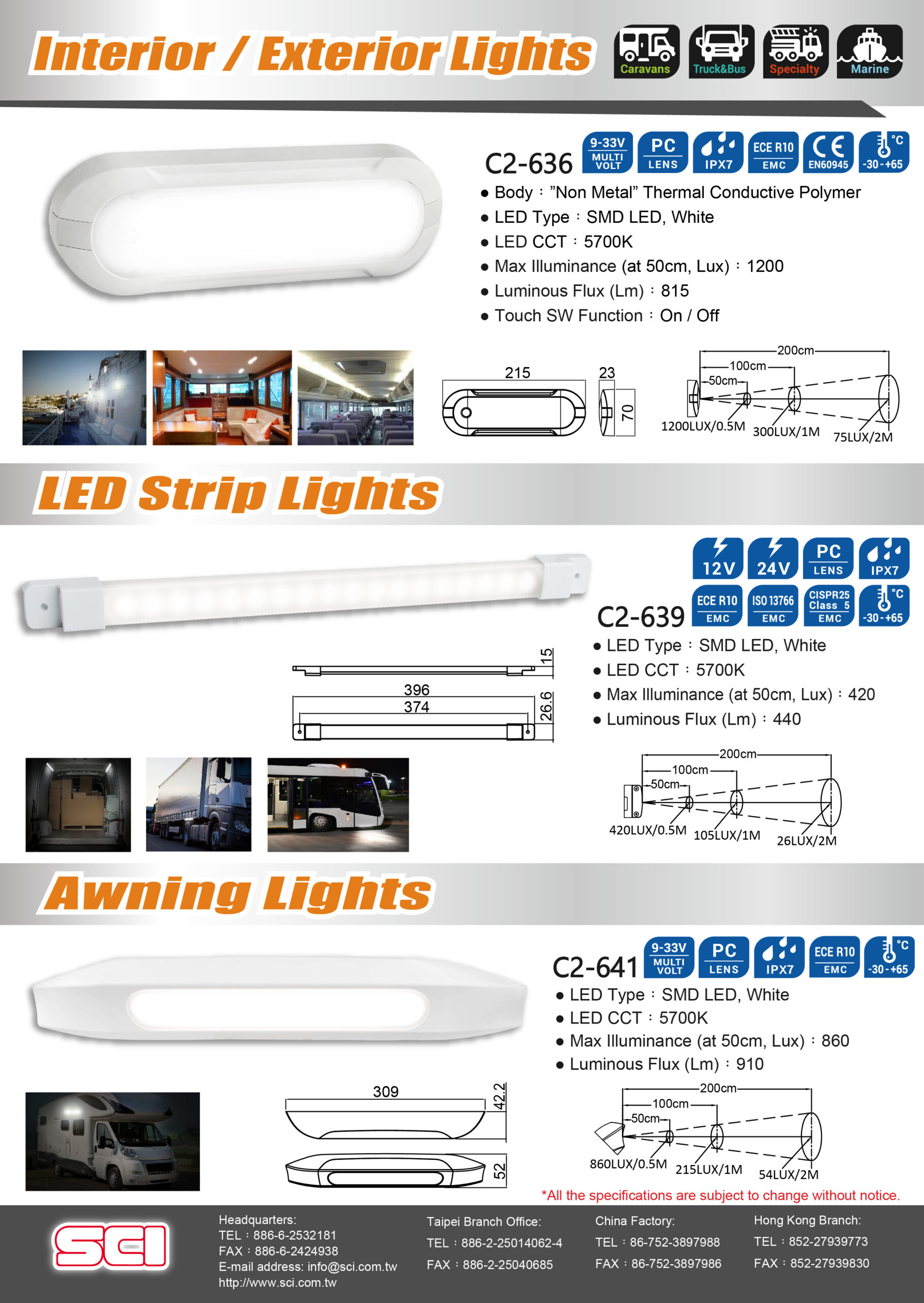 高亮度車用室內&外裝照明燈,具備優異的照度與與柔和的面光感視覺,可適合需要高亮度的商用車&船舶上,不論內裝&外裝都可適用,全機防水,採特殊混合本體材料在對應船舶上可對抗海上耐腐蝕問題