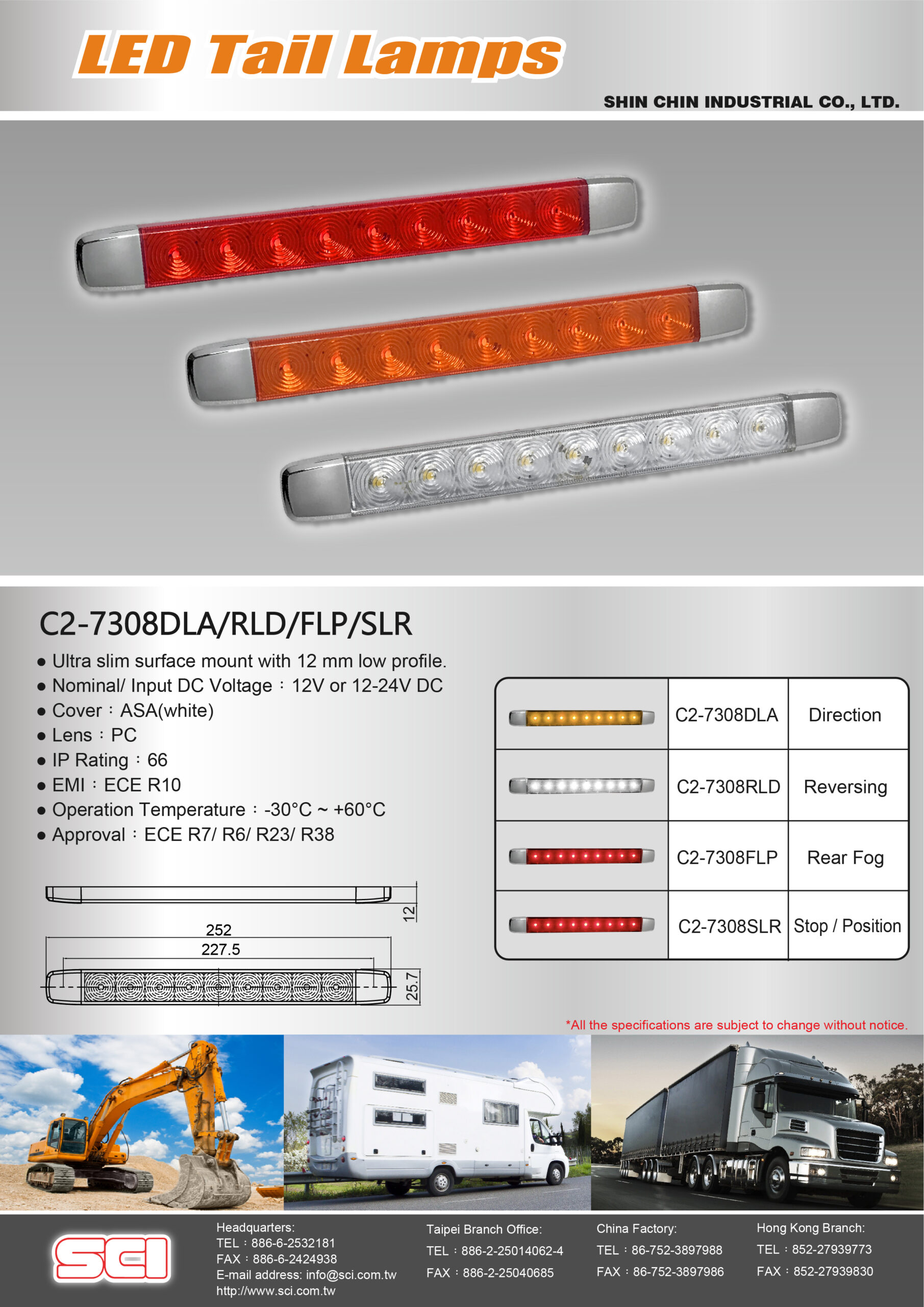 Slim rear fog strip lamp which meets ECE certificate is suitable for commercial vehicle (CV) and recreational vehicle (RV) with 12/24V system.